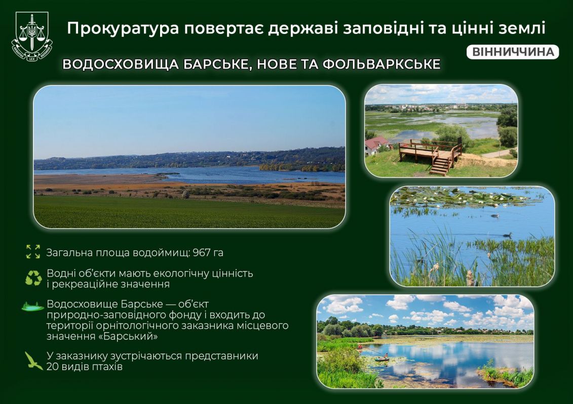In Vinnytsia region the Prosecutor's Office has ensured the implementation of court decisions to return to the disposal of the Bar City Community the Bar, Nove, and Folvarkske reservoirs, which have ecological value and serve as a place of recreation for people. Their total area is 967 hectares.