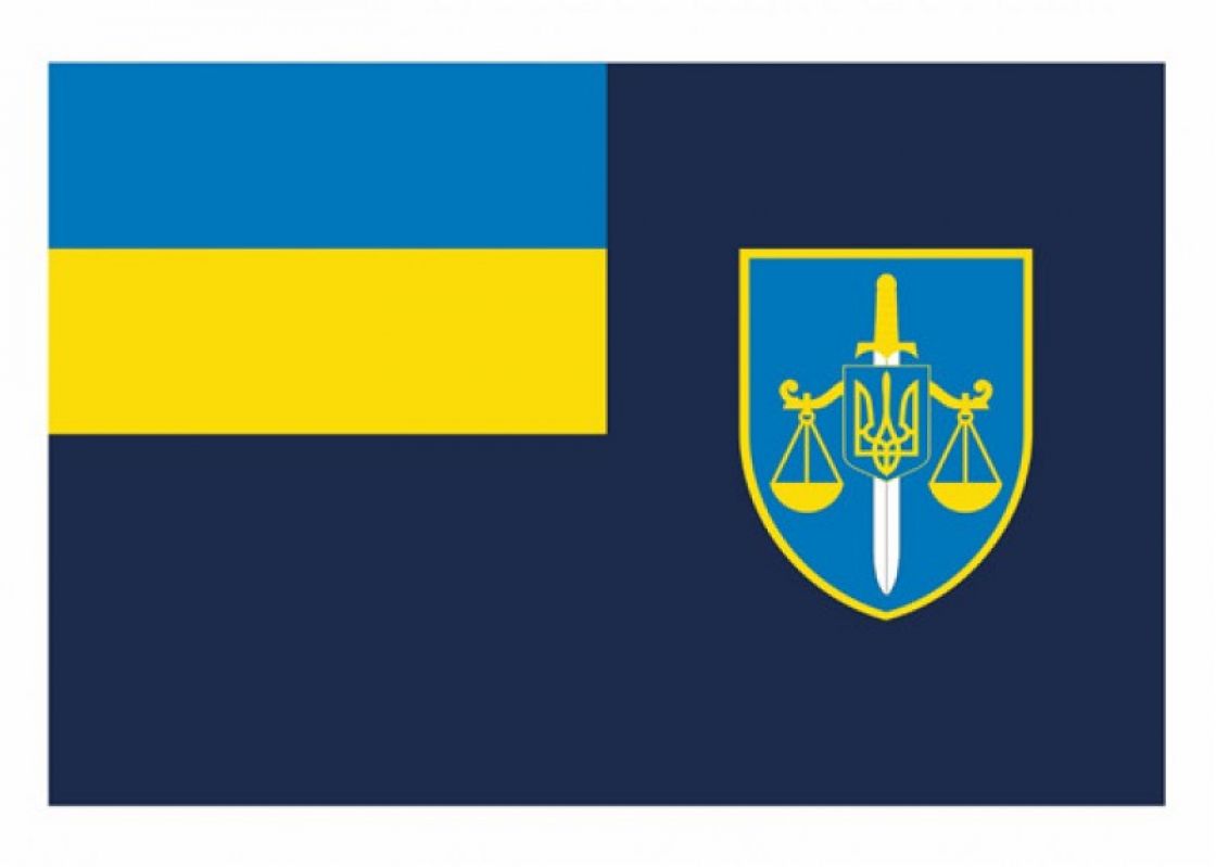 In the upper left quarter of the flag, there are two equally sized horizontal stripes of blue and yellow colors, and in the center of the free edge of the cloth – the emblem of the Office of the Prosecutor General with a border without a ribbon with a motto. The height of the emblem is 1/2 the width of the cloth.