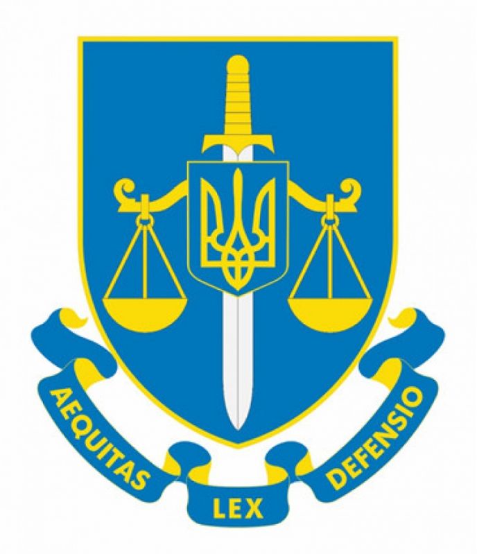 Below the shield is a blue ribbon with a golden lining, on which the motto is inscribed in golden letters: "AEQUITAS, LEX, DEFENSIO" (from Latin – "JUSTICE, LAW, DEFENSE").