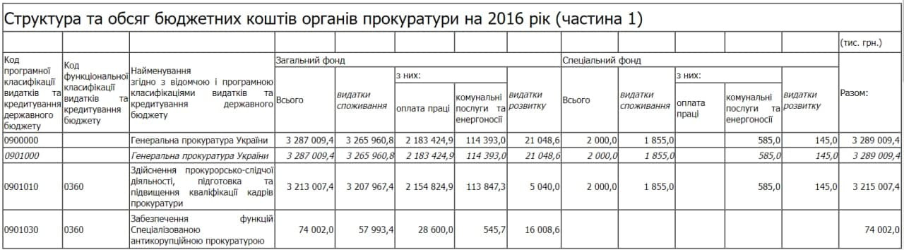 The structure and volume of budget funds of the prosecutor's office for 2016 (Part 1)