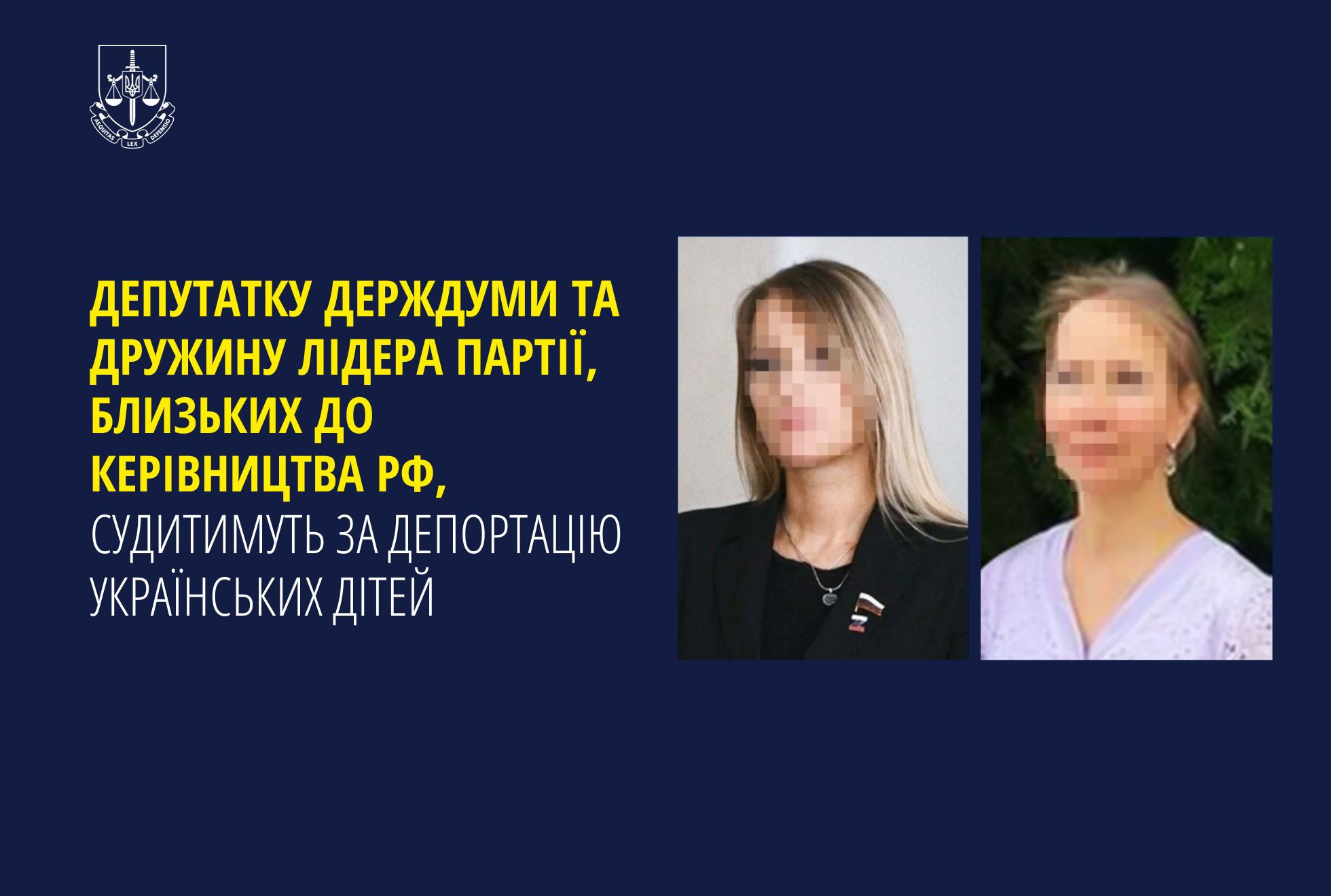 Прокурори Офісу Генерального прокурора скерували до суду обвинувальний акт стосовно двох громадянок рф, наближених до президента держави-агресора, за фактом порушення законів та звичаїв війни (ч. 2 ст. 28 ч. 1 ст. 438 КК України).