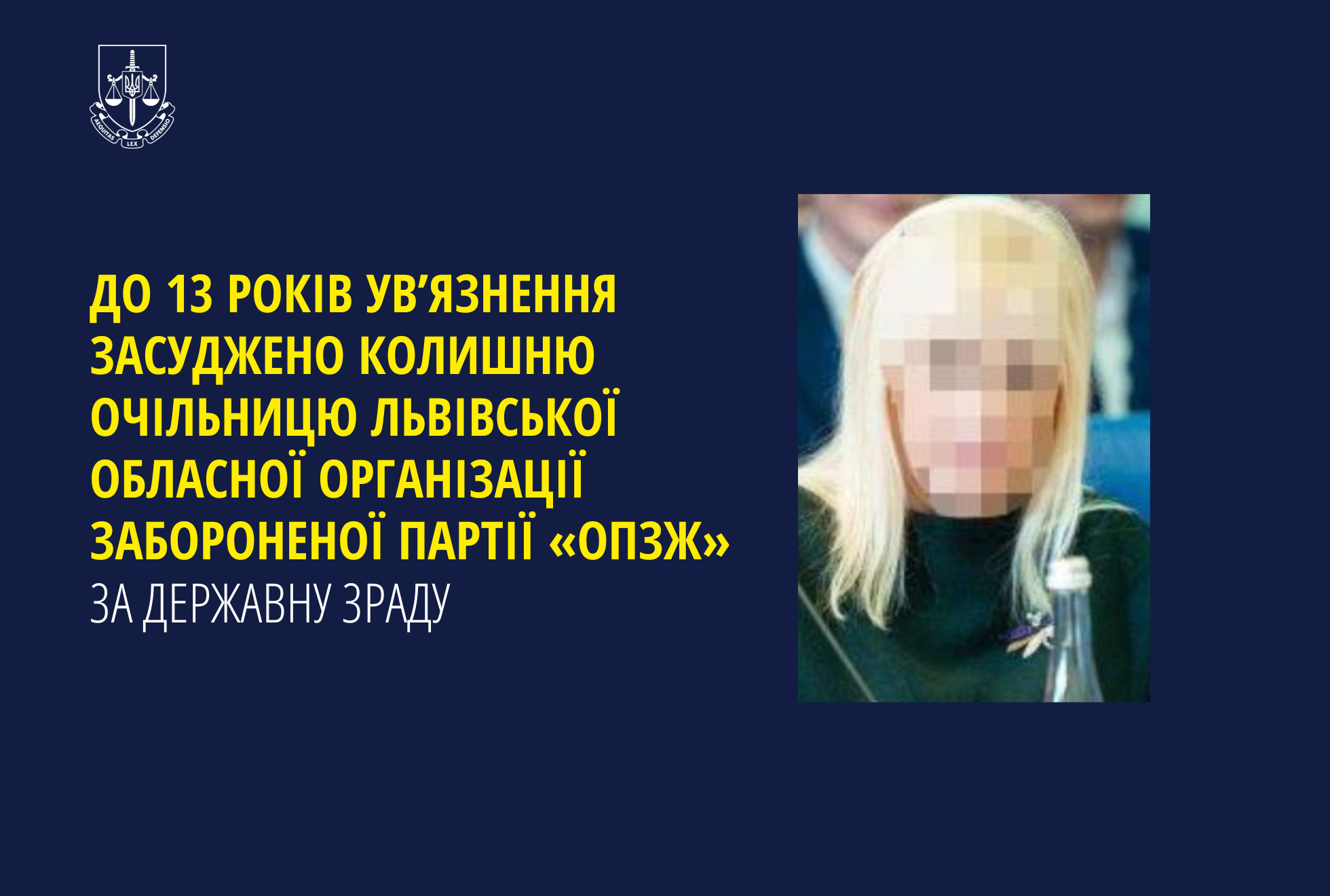 За публічного обвинувачення прокурорів Львівської обласної прокуратури суд визнав винною колишню очільницю обласної організації забороненої в Україні партії «ОПЗЖ» у вчиненні державної зради (ч. 1 ст. 111 КК України).