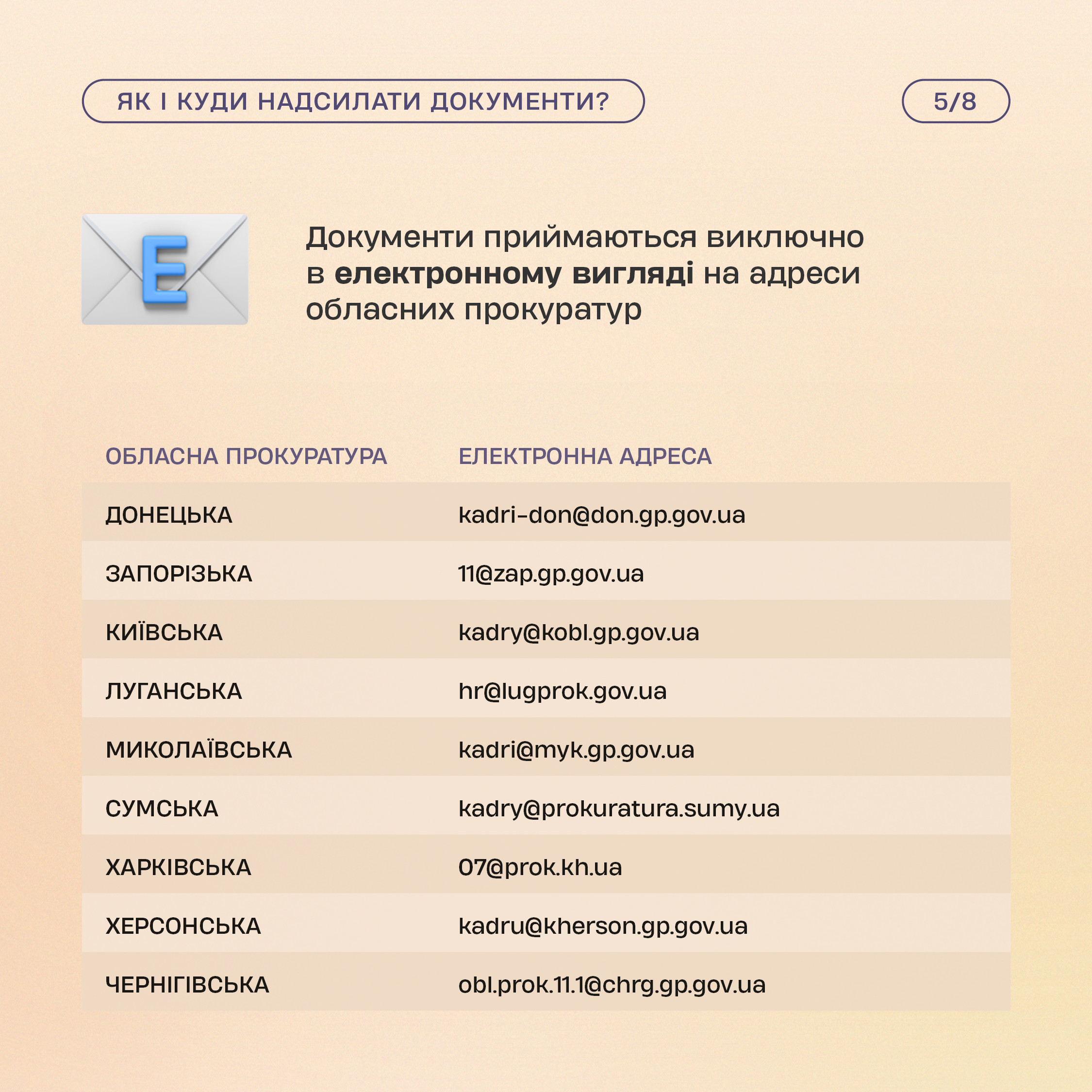 Особи, які бажають взяти участь у наборі, подають повний пакет документів виключно в електронному вигляді на адреси бажаних обласних прокуратур: