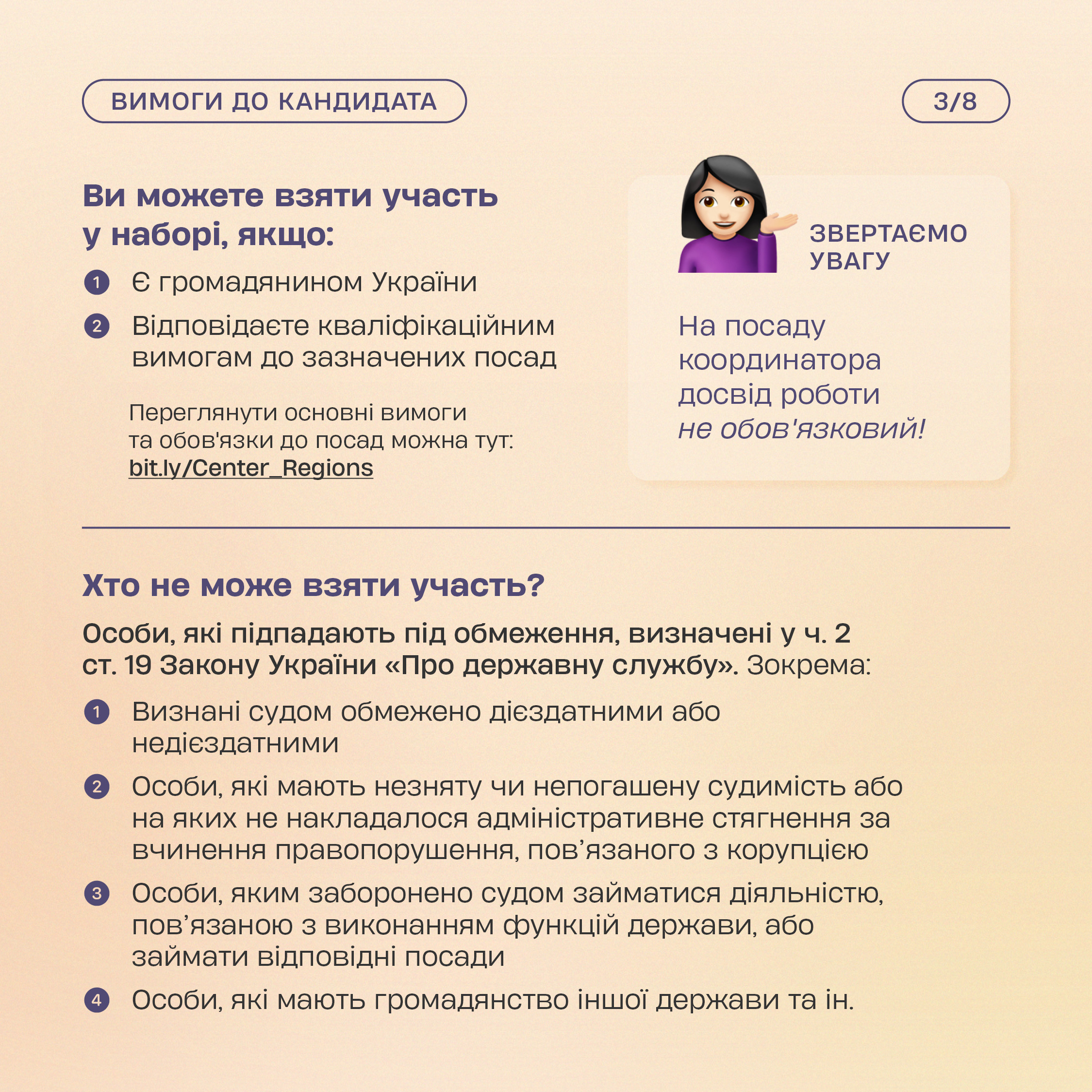 Оголошено набір на 28 посад, зокрема доступно 19 вакансій координаторів та 9 вакансій начальника відділу. Нижче — короткий огляд вакантних посад з переліком основних обовʼязків та вимог, а також необхідних для подачі документів.