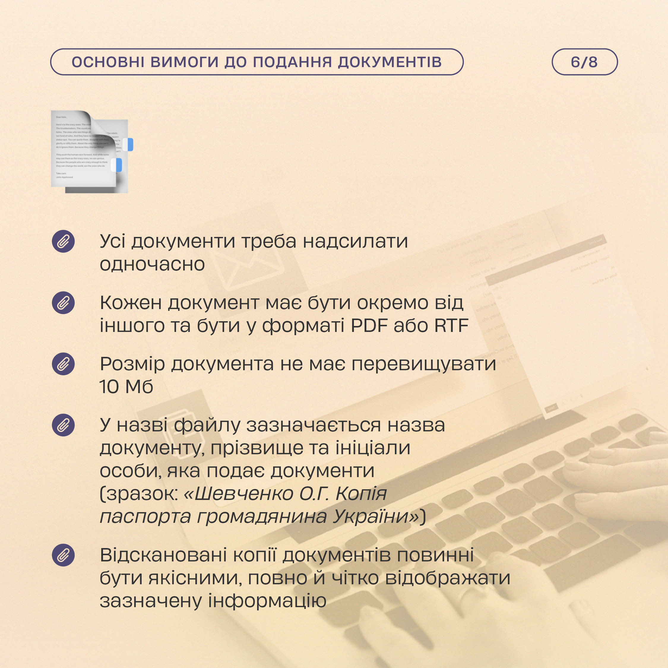 Кожен електронний документ має бути збережено окремим файлом у форматі «pdf» чи «rtf» розміром до 10 Мб. В імені файлу зазначаються прізвище, ініціали особи, яка подає документи, назва документа (зразок: «Шевченко О.Г. Копія паспорта громадянина України»).