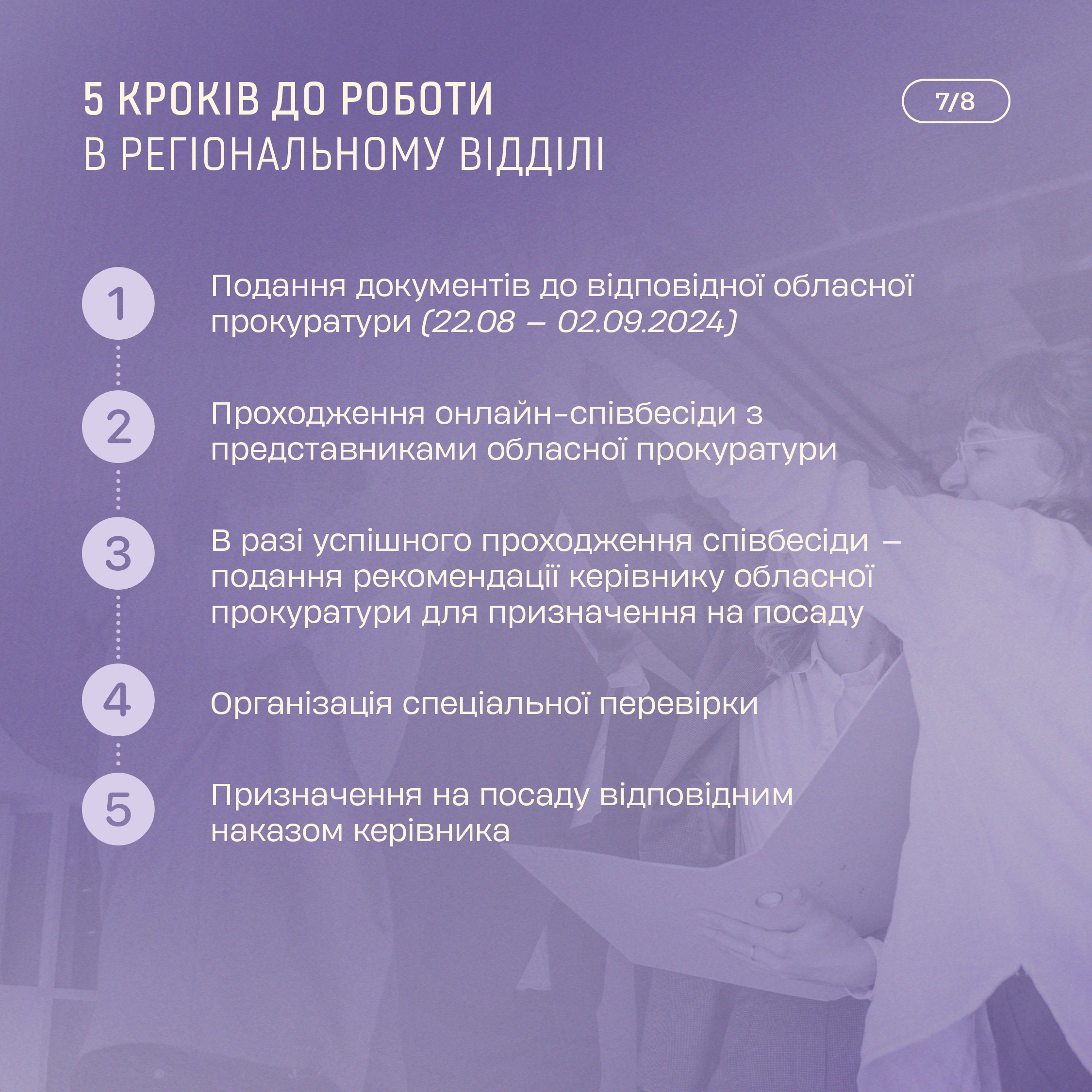 Зокрема, кандидати надсилають документи до обласної прокуратури бажаного регіону, перевіряється відповідність кандидата вимогам до посади, в подальшому кандидати запрошуються до проходження онлайн-співбесіди.