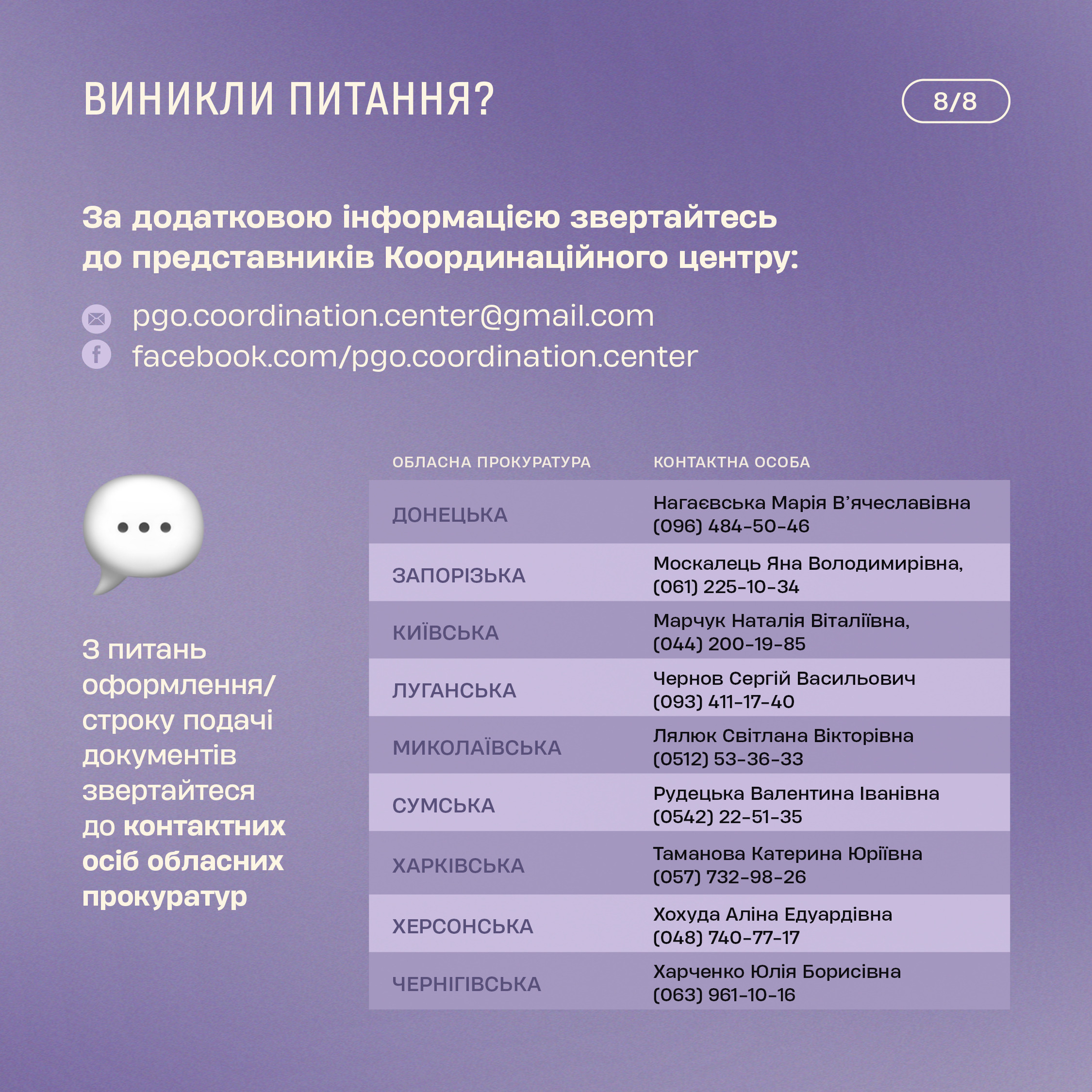 З питань оформлення/строку подачі документів звертайтеся до контактних осіб обласних прокуратур.