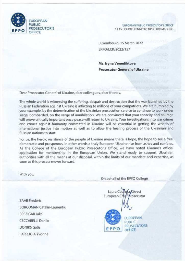 Генеральний прокурор Ірина Венедіктова провела зустріч з Головним прокурором ЄС Лаурою Кевеші. Вона перша офіційна особа Євросоюзу, яка відвідала Україну у воєнний час. За результатами зустрічі сторони підписали Робочу угоду про співпрацю між Офісом Генерального прокурора та Європейською прокуратурою (EPPO).