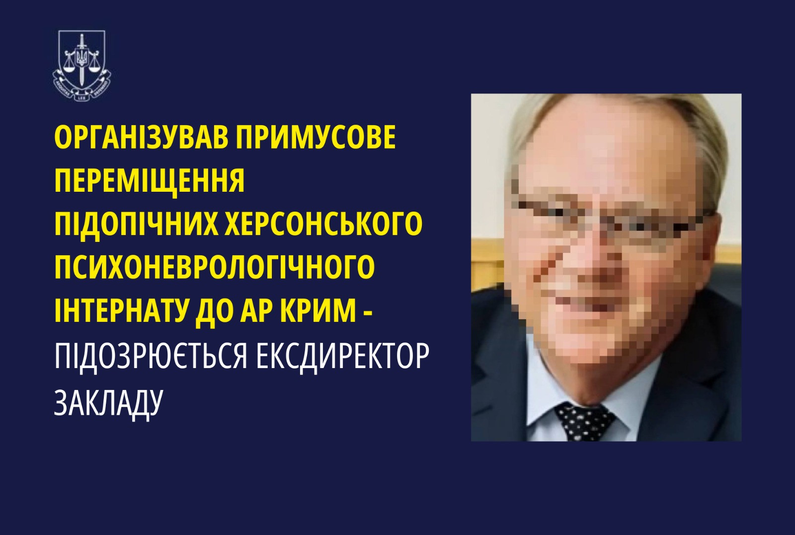 За процесуального керівництва Херсонської обласної прокуратури колишньому директору Херсонського психоневрологічного будинку-інтернату заочно повідомлено про підозру у пособництві державі-агресору та інших порушеннях законів та звичаїв війни (ч. 1 ст. 111-2, ч. 2 ст. 28, ч. 1 ст. 438 КК України).
