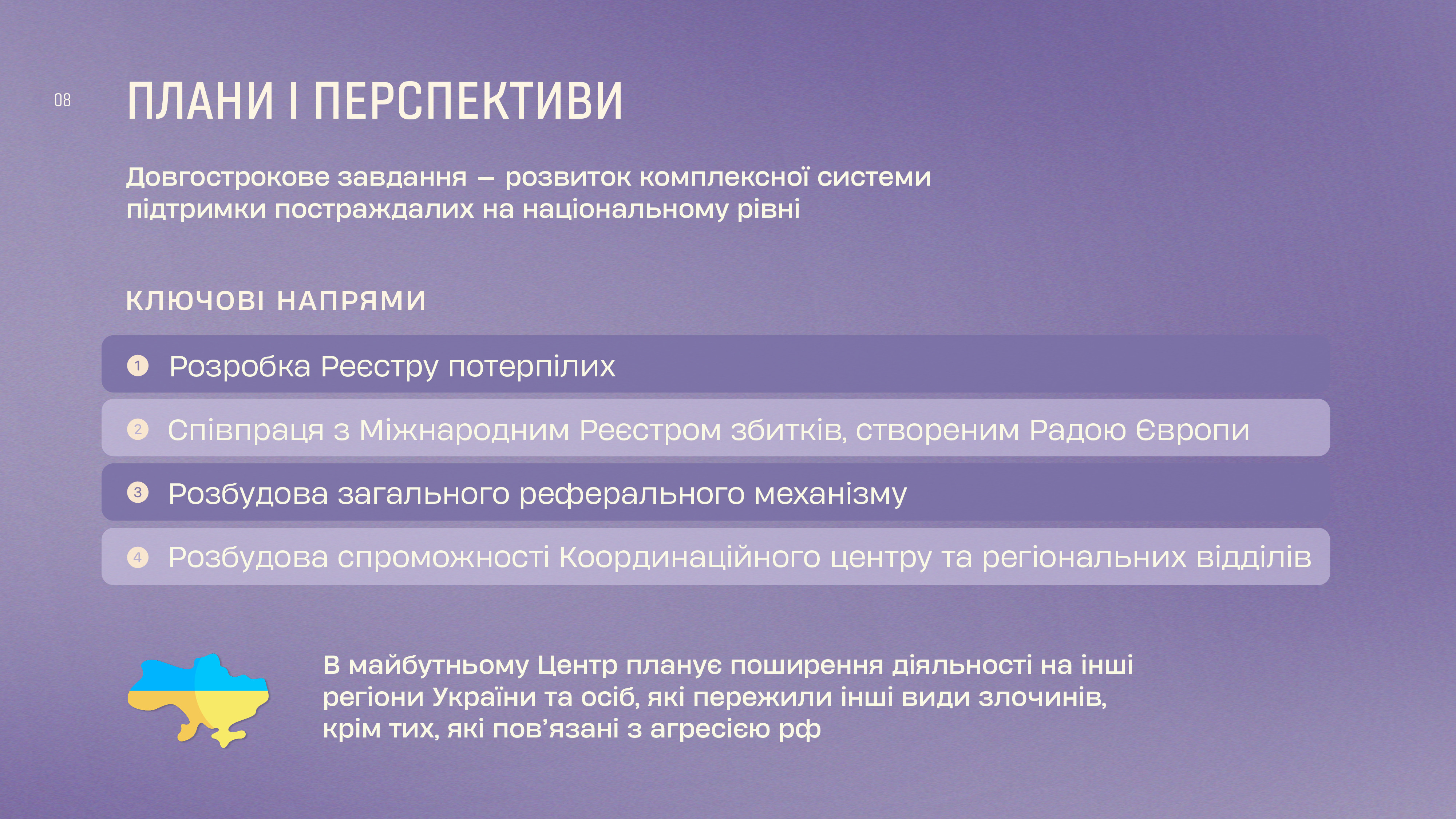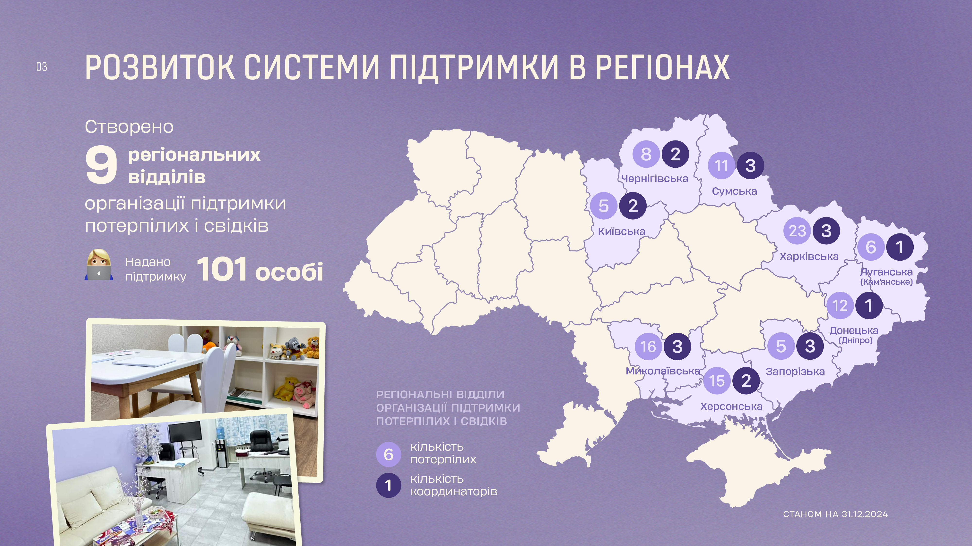 У 2024 році створено 9 регіональних відділів у Київській, Донецькій, Луганській, Запорізькій, Миколаївській, Херсонській, Сумській, Харківській та Чернігівській областях. У цих регіонах вже працюють 20 координаторів для взаємодії з потерпілими.