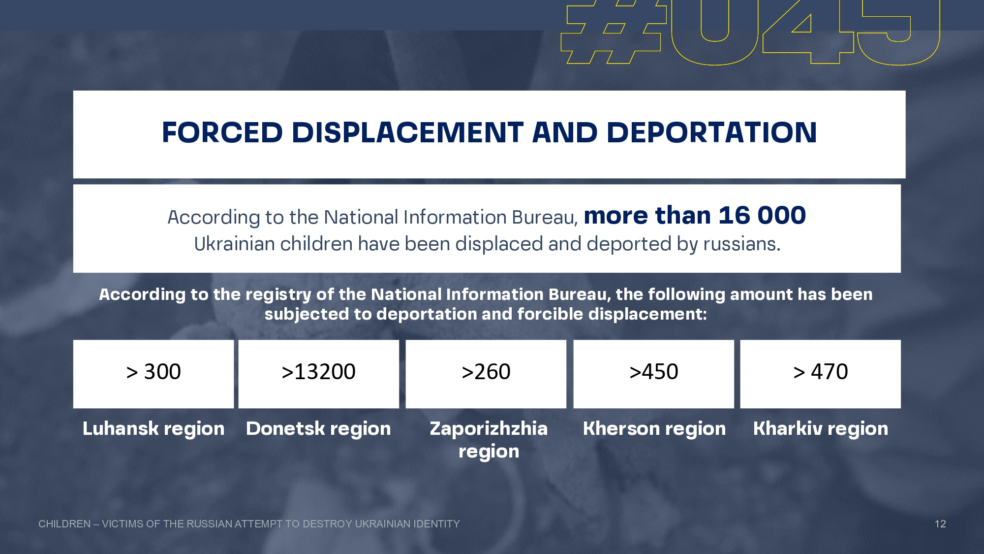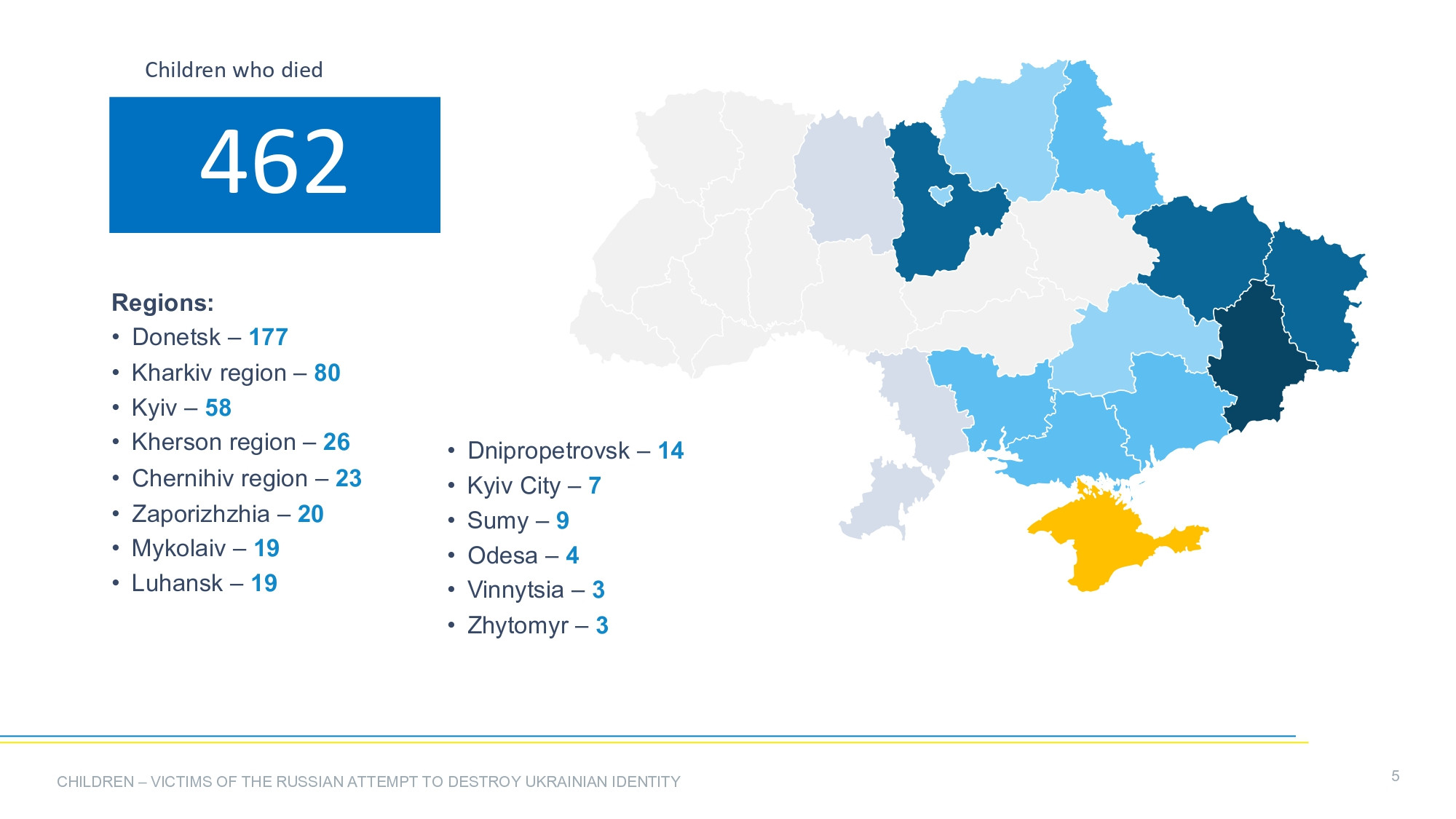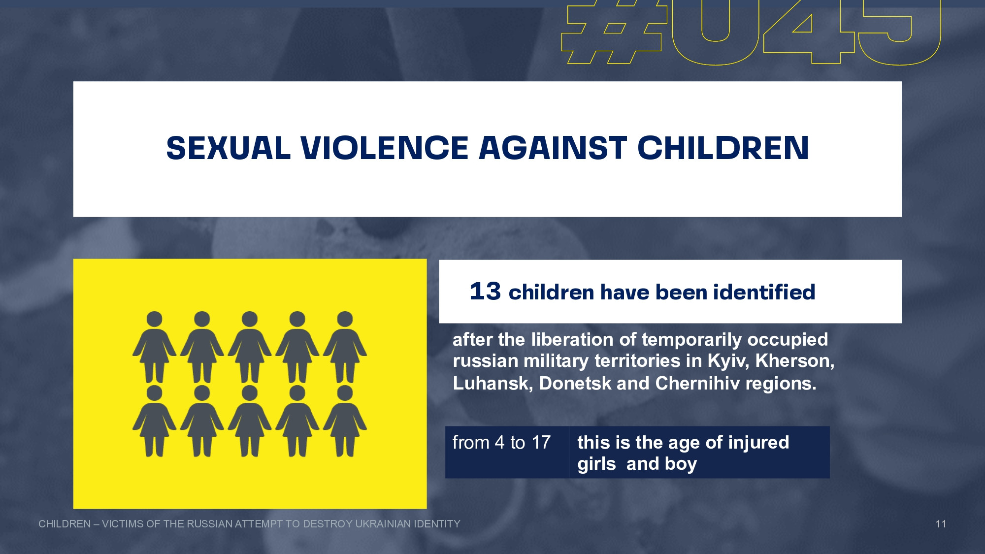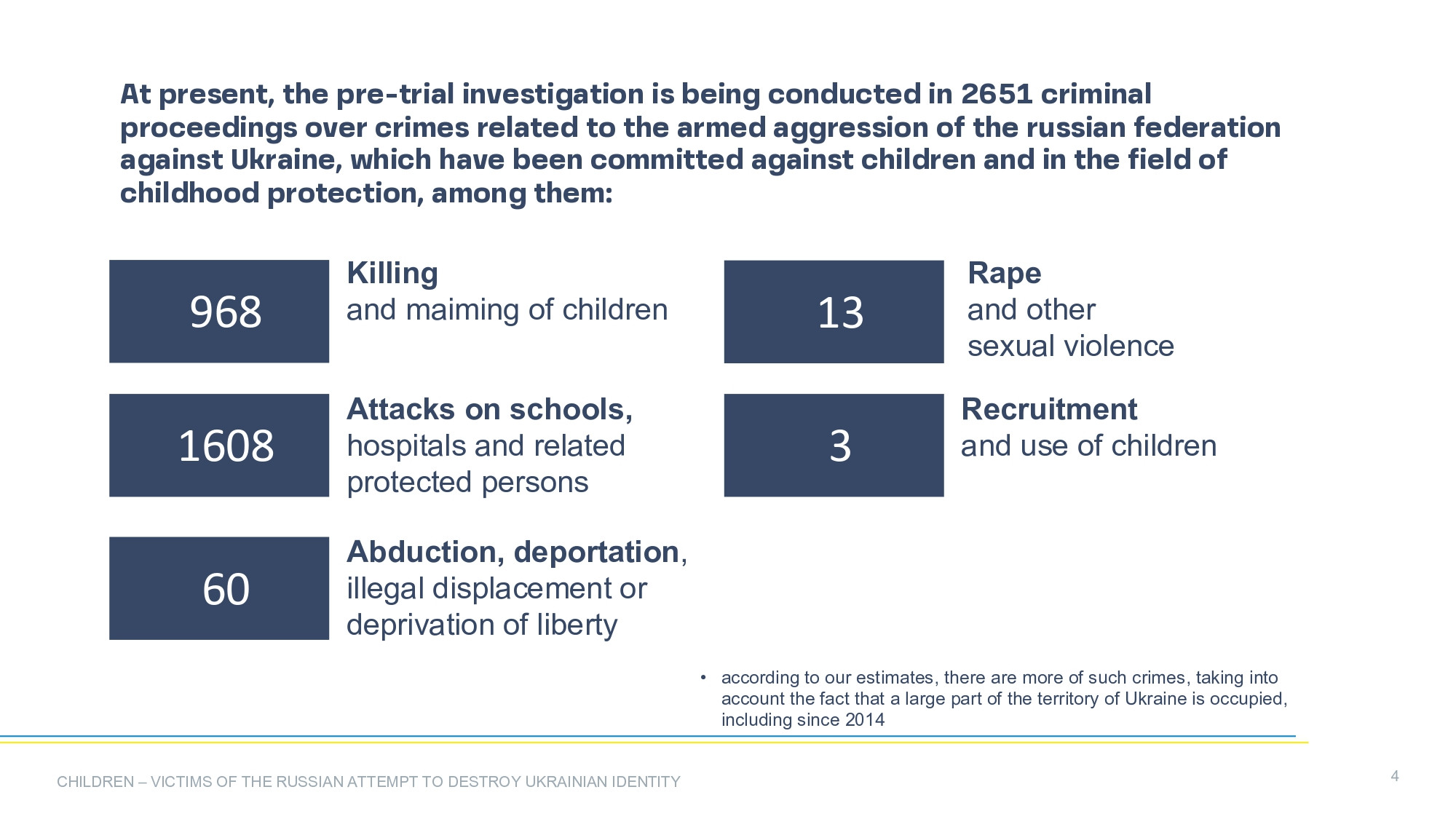Вона розповіла, що наразі правоохоронці документують шість серйозних порушень норм міжнародного гуманітарного права, які вчиняються проти українських дітей. Це вбивство і каліцтва; зґвалтування та інші форми сексуального насильства; відмова у доступі до гуманітарної допомоги; викрадення; вербування і використання дітей; напади на школи, лікарні, дитячу інфраструктуру.