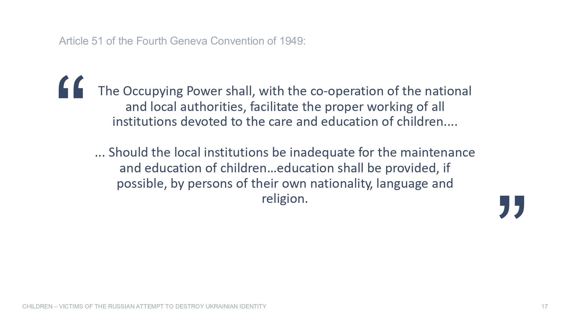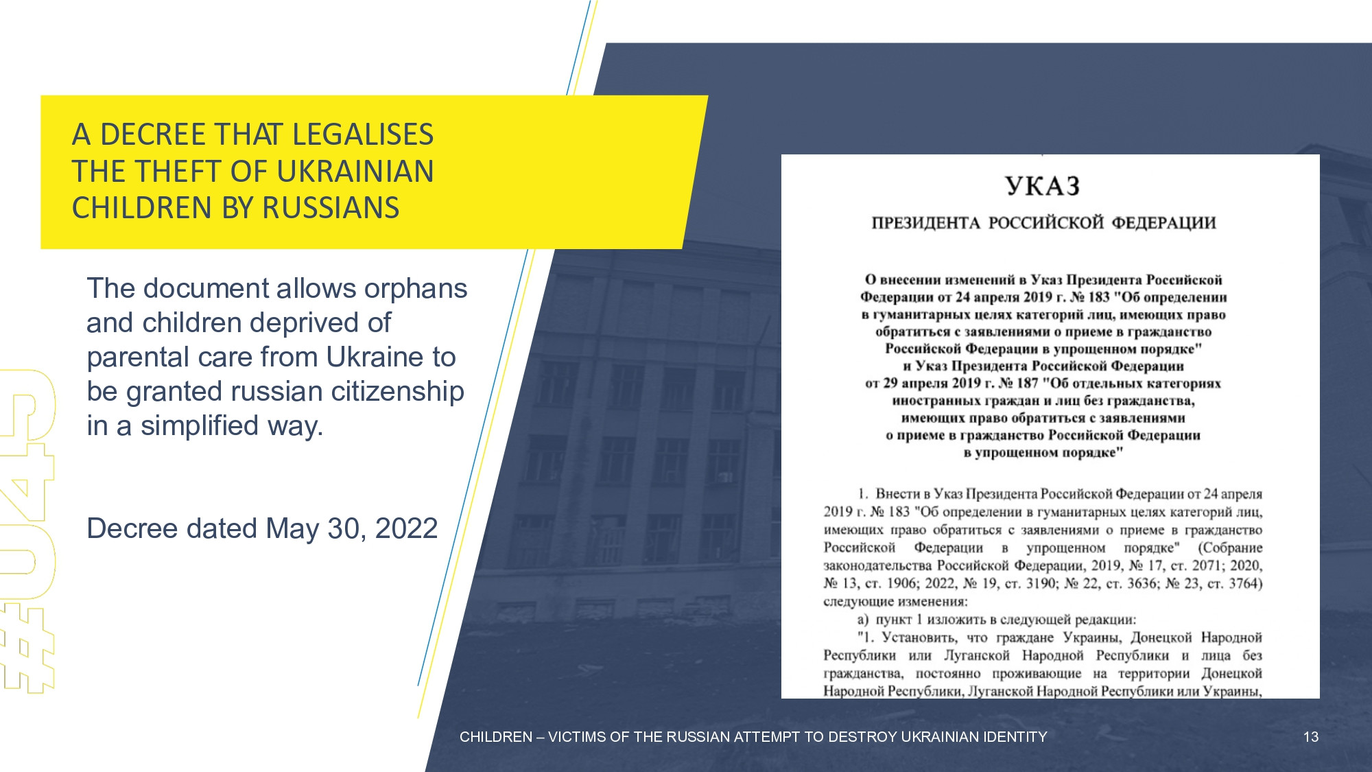 «Ми забезпечимо притягнення до відповідальності кожного, хто планував, організовував і виконував злочини проти дітей України. І ми всі надалі повинні шукати міжнародно-правові механізми відновлення справедливості, повернення українських дітей додому та гарантування, щоб у кожної української дитини було дитинство», – констатувала Вікторія Літвінова.