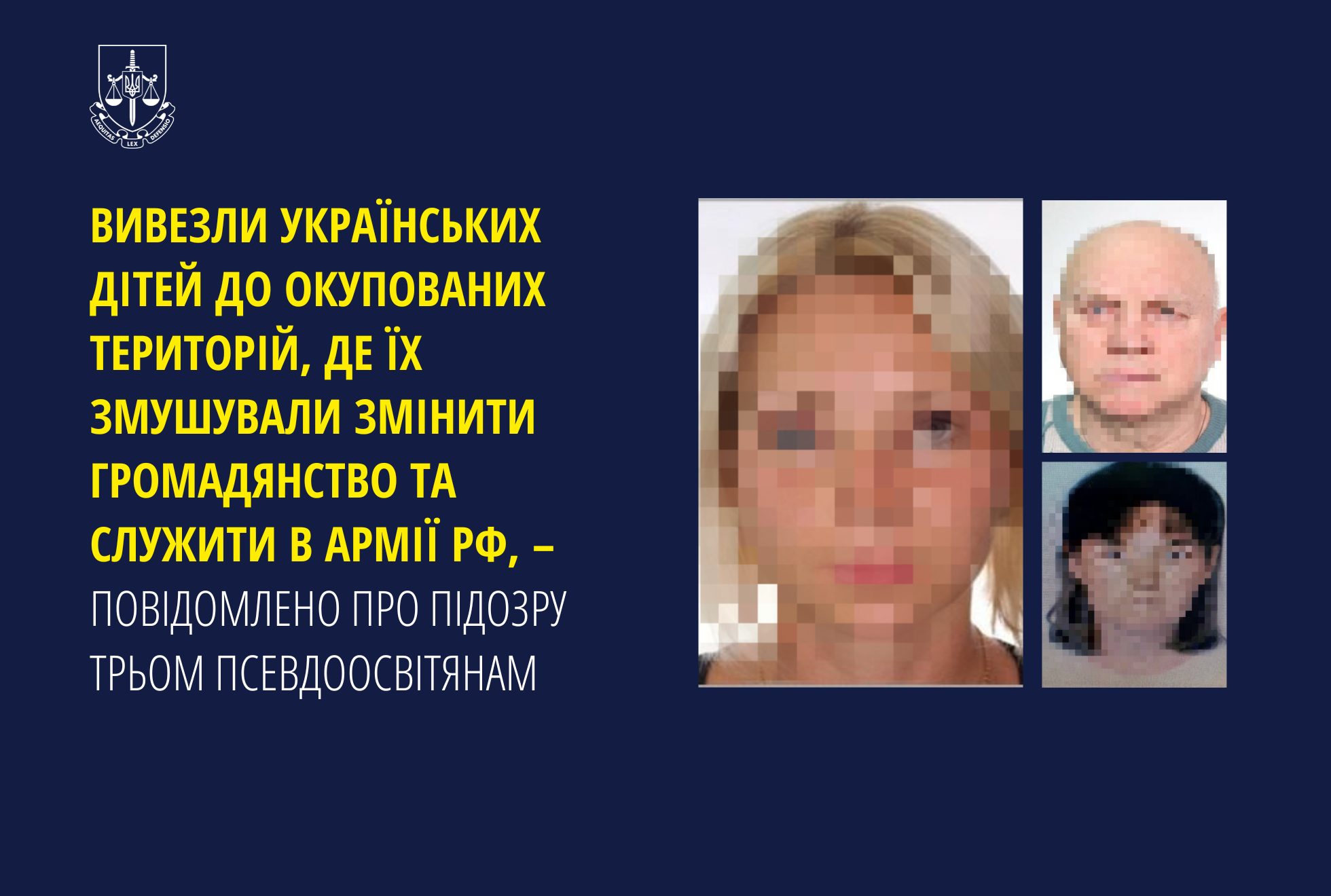 За процесуального керівництва ювенальних прокурорів Офісу Генерального прокурора повідомлено про підозру трьом громадянам України, які сприяли незаконному переміщенню шести українських дітей на тимчасово окуповану територію. Двом жінкам та чоловіку інкримінують вчинення порушення законів та звичаїв війни (ч. 1 ст. 438 КК України).