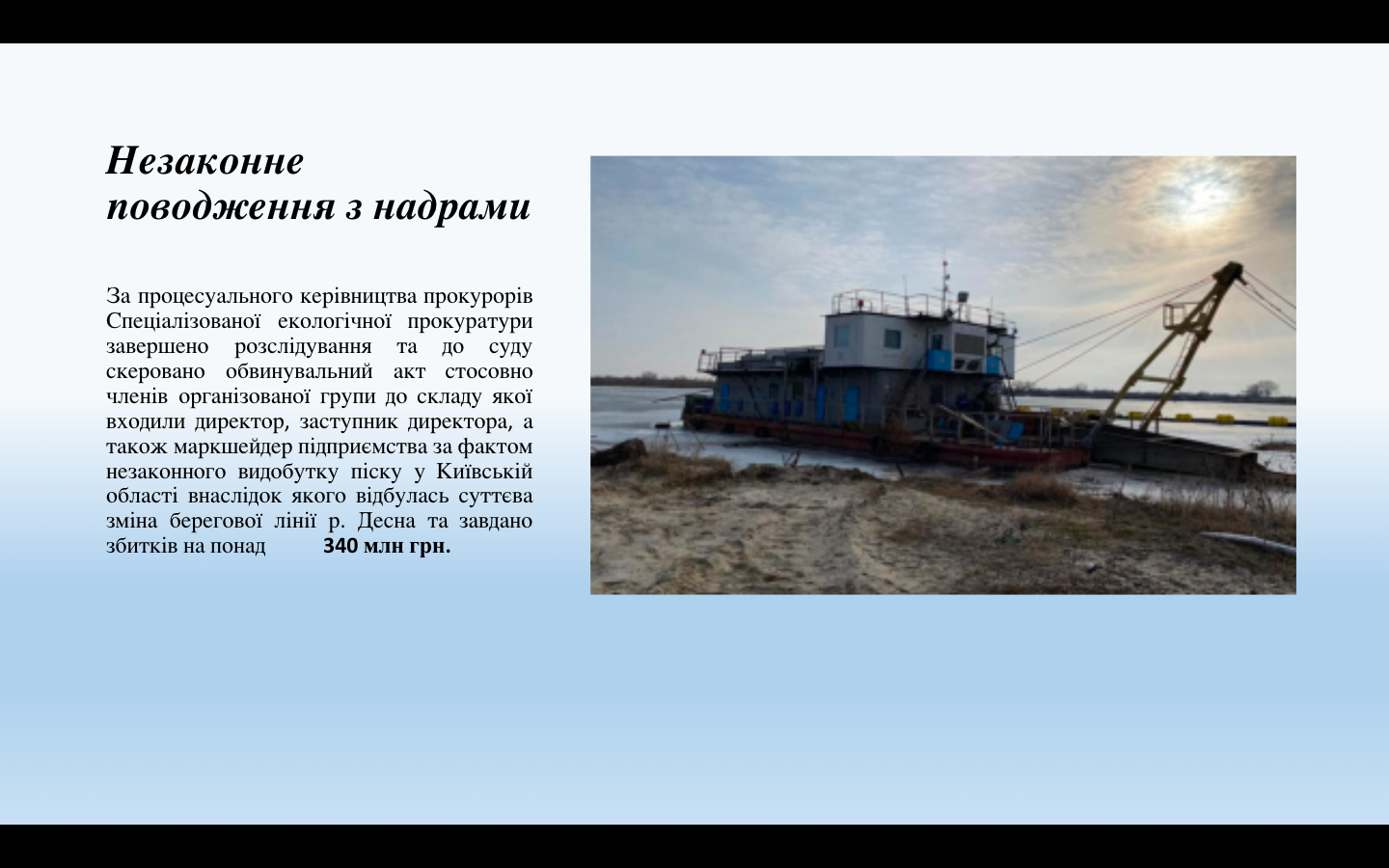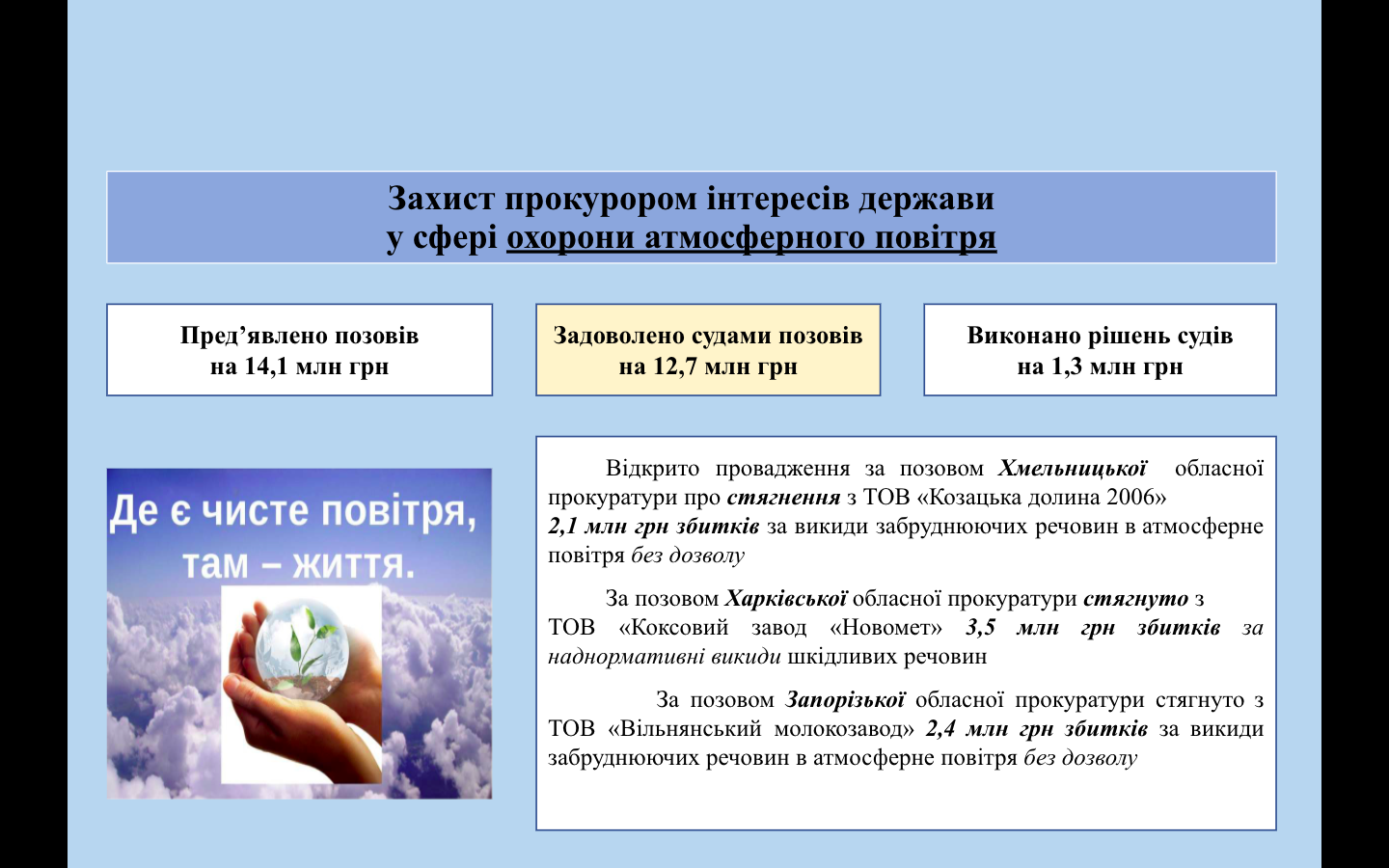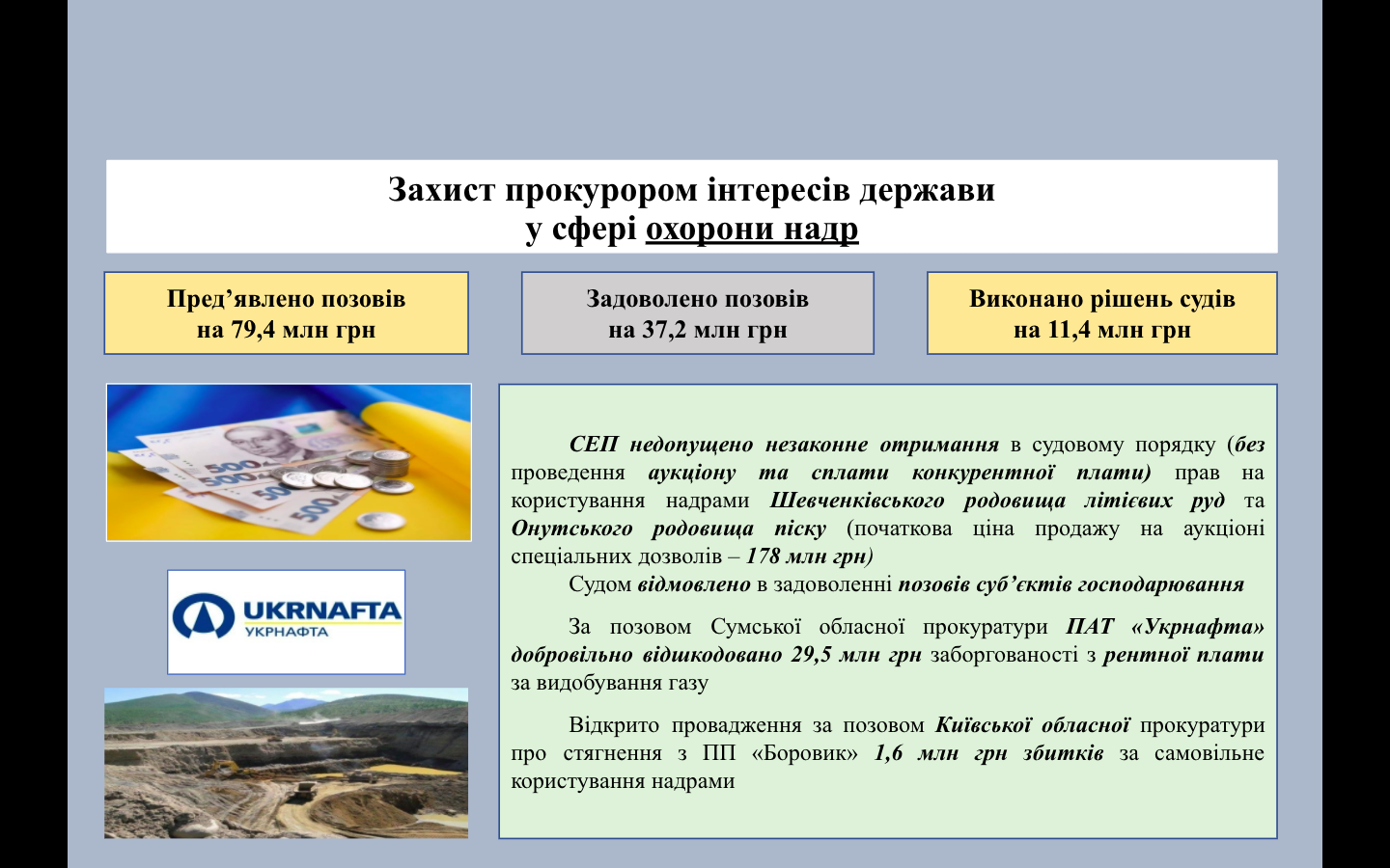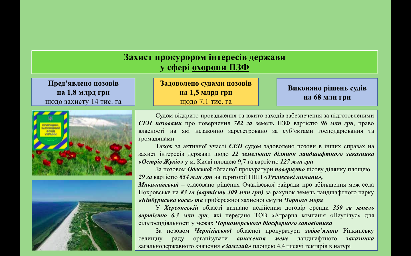 Пріоритетом у діяльності екологічних прокуратур є не лише протидія правопорушенням у сфері охорони навколишнього природного середовища (зокрема, протиправного надрокористування, браконьєрства, незаконної рубки лісів та забруднення атмосферного повітря, розкрадання земель природно-заповідного фонду), але і відновлення шляхом захисту у суді становища, яке існувало до порушення, або у разі неможливості це зробити – стягнути шкоду, заподіяну природі.