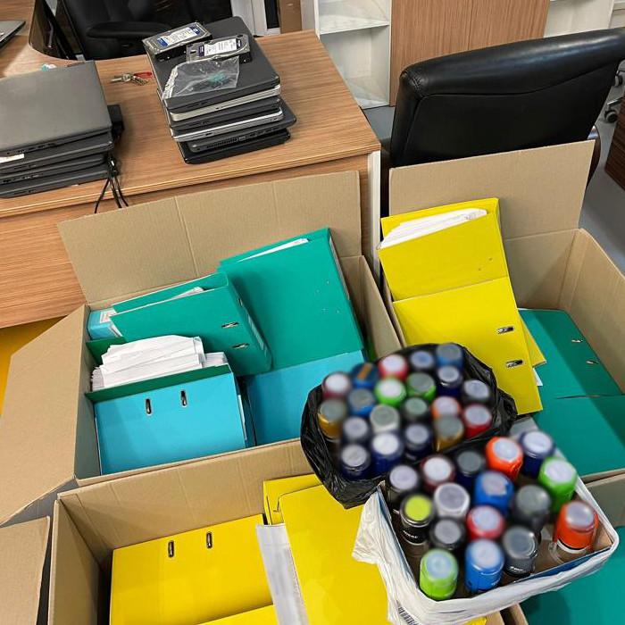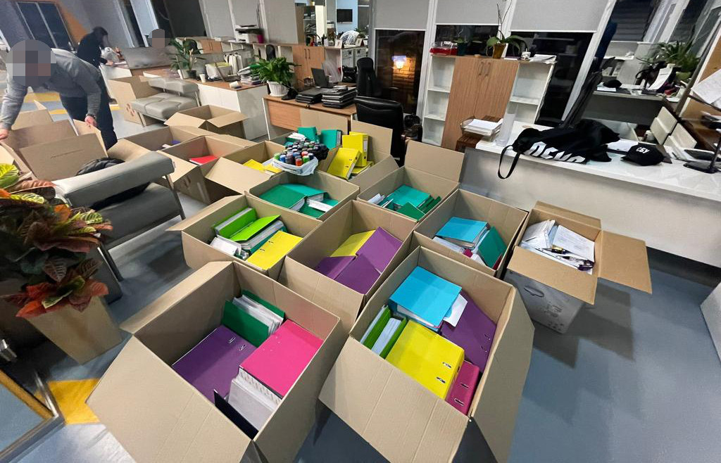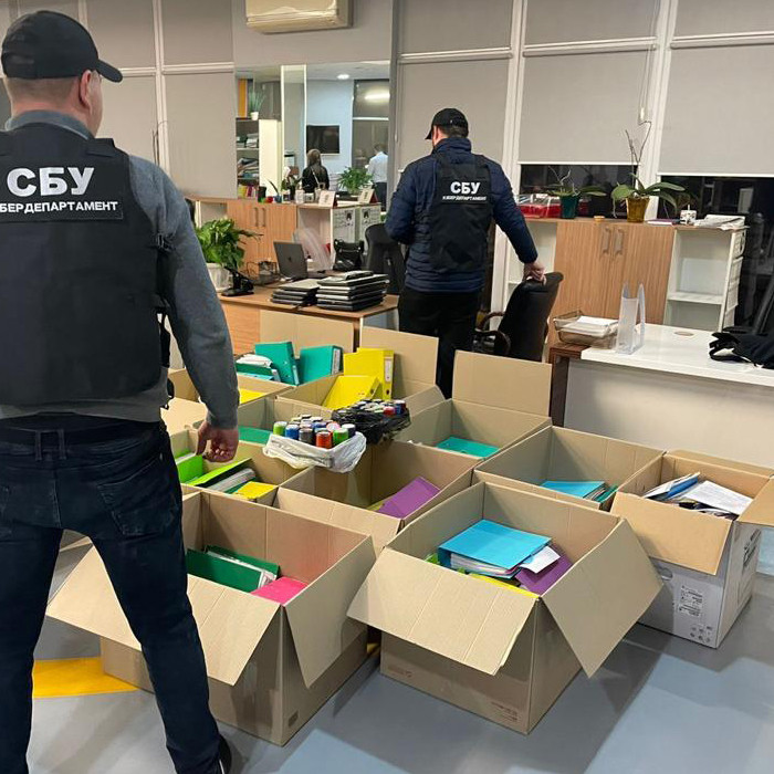 Під час обшуку в приміщенні тіньового офісу компаній, які підконтрольні бенефіціару компанії-генерального підрядника будівництва, вилучено документи, які відображають протиправну діяльність, 37 печаток товариств з ознаками фіктивності, залучених до обготівкування коштів, носії інформації та інші докази, які мають значення для кримінального провадження.