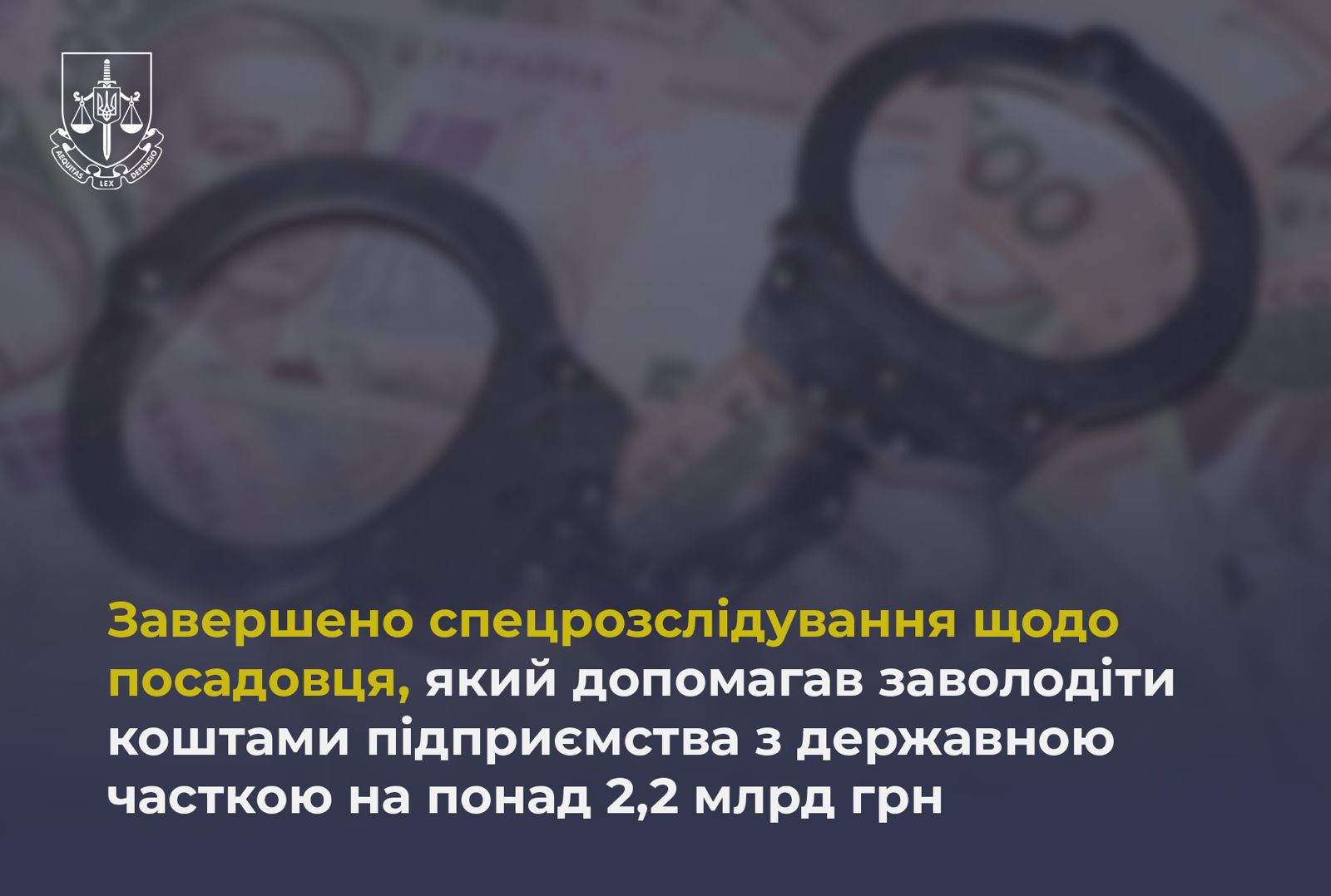 Завершено спецрозслідування щодо посадовця, який допомагав заволодіти коштами підприємства з державною часткою на понад 2,2 млрд грн